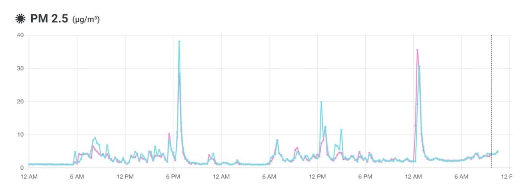 Particulate Matter (PM2.5) refers to tiny particles in the air that are 2.5 microns or less in width. Here on the chart where spikes occur, it is being speculated that this indicates when trucks are entering/exiting the jobsite.