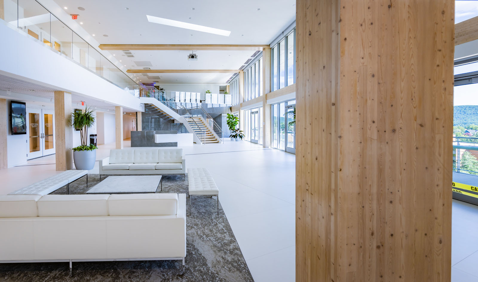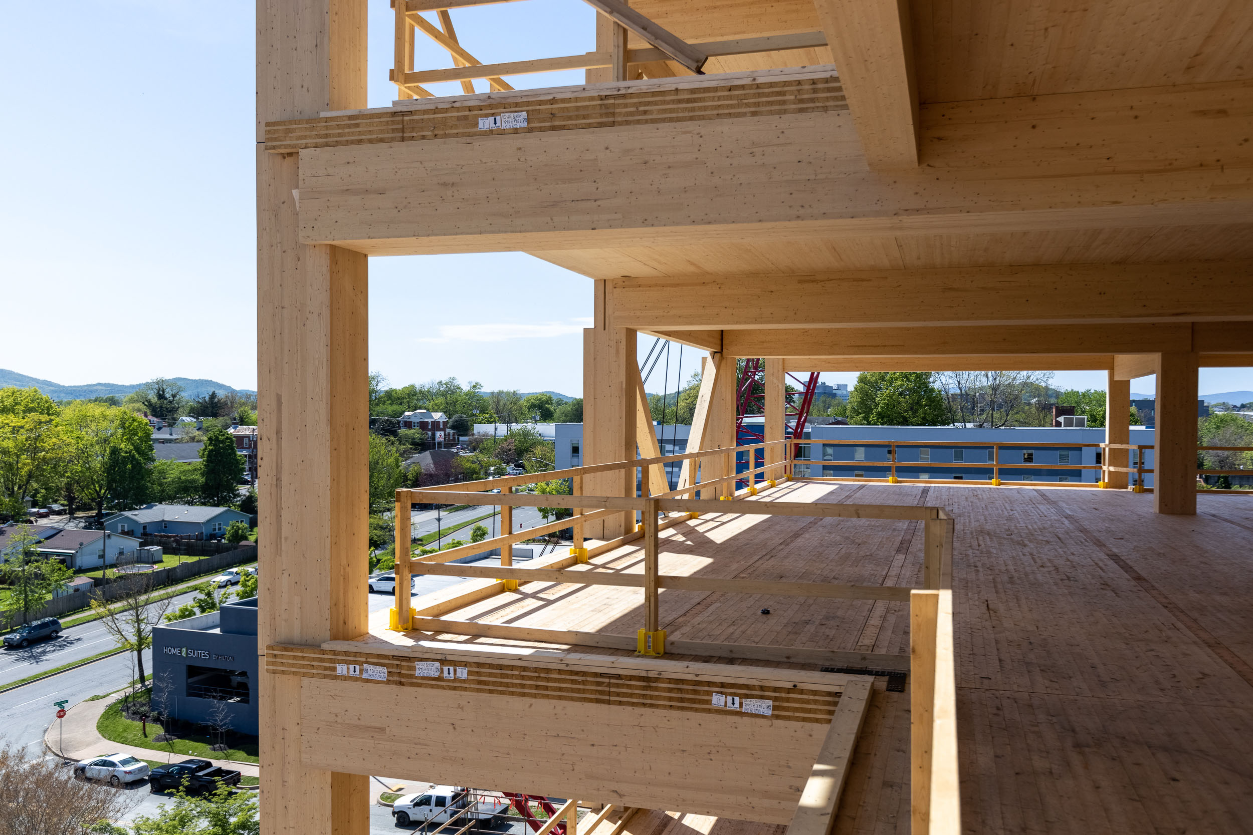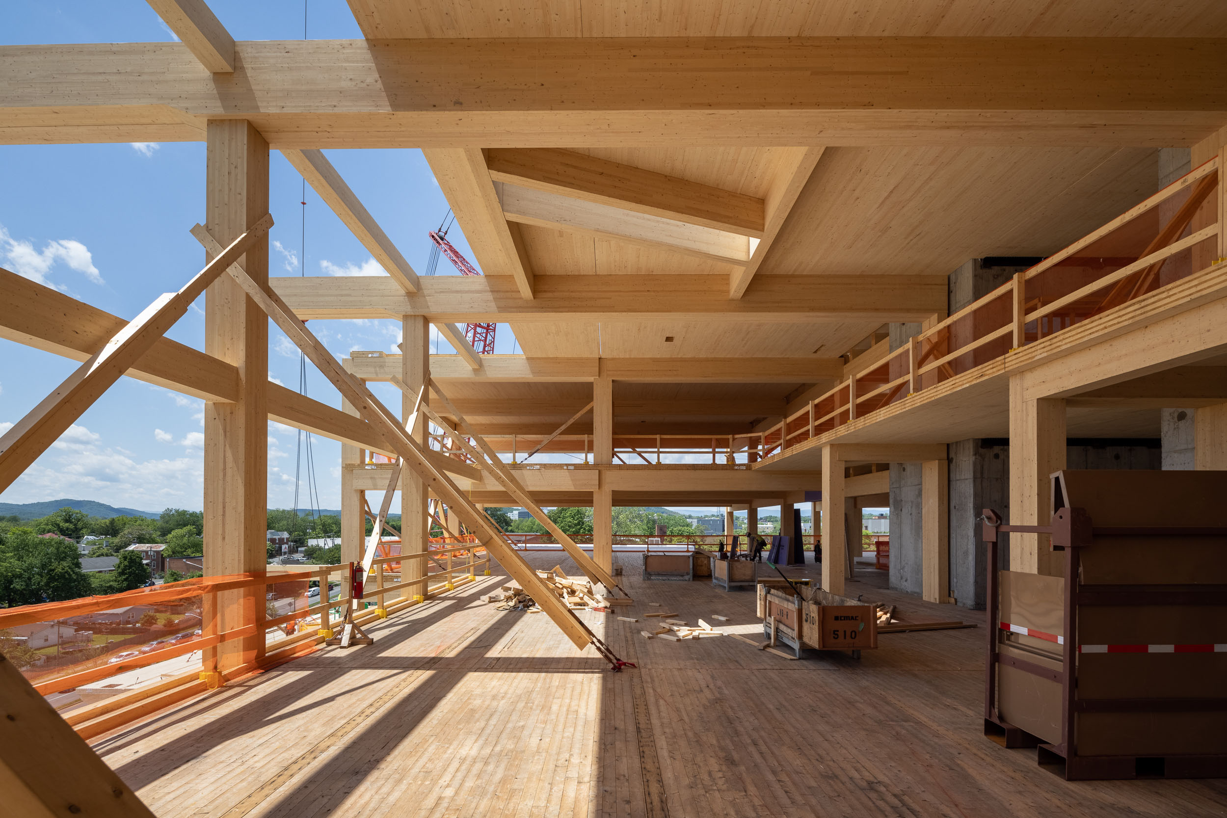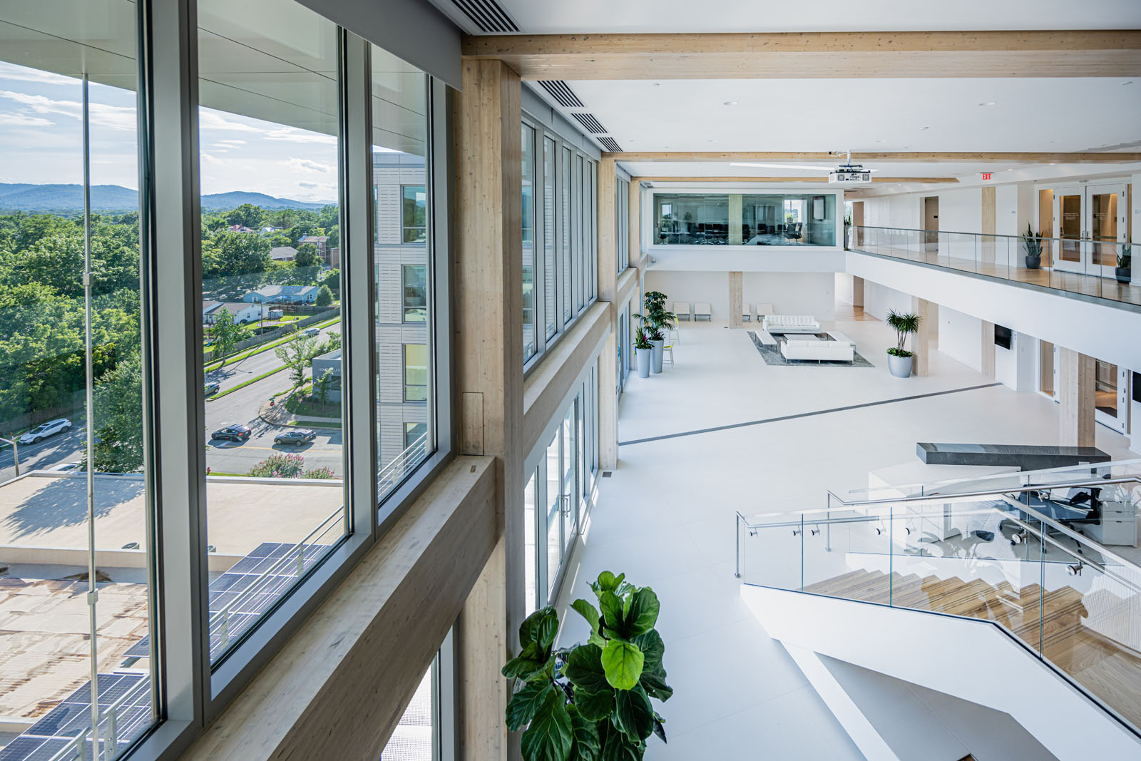 The use of structural wood harvested from fast-growth timber is one of the many sustainable features of Apex Plaza. Much like a healthy tree stores carbon dioxide, one square meter of cross-laminated timber can remove approximately one ton of the greenhouse gas from the atmosphere. Additionally, the building’s 875 solar panels are designed to produce as much electricity as lead tenant Apex Clean Energy consumes in a given year, leaving the company with net-zero electricity use.