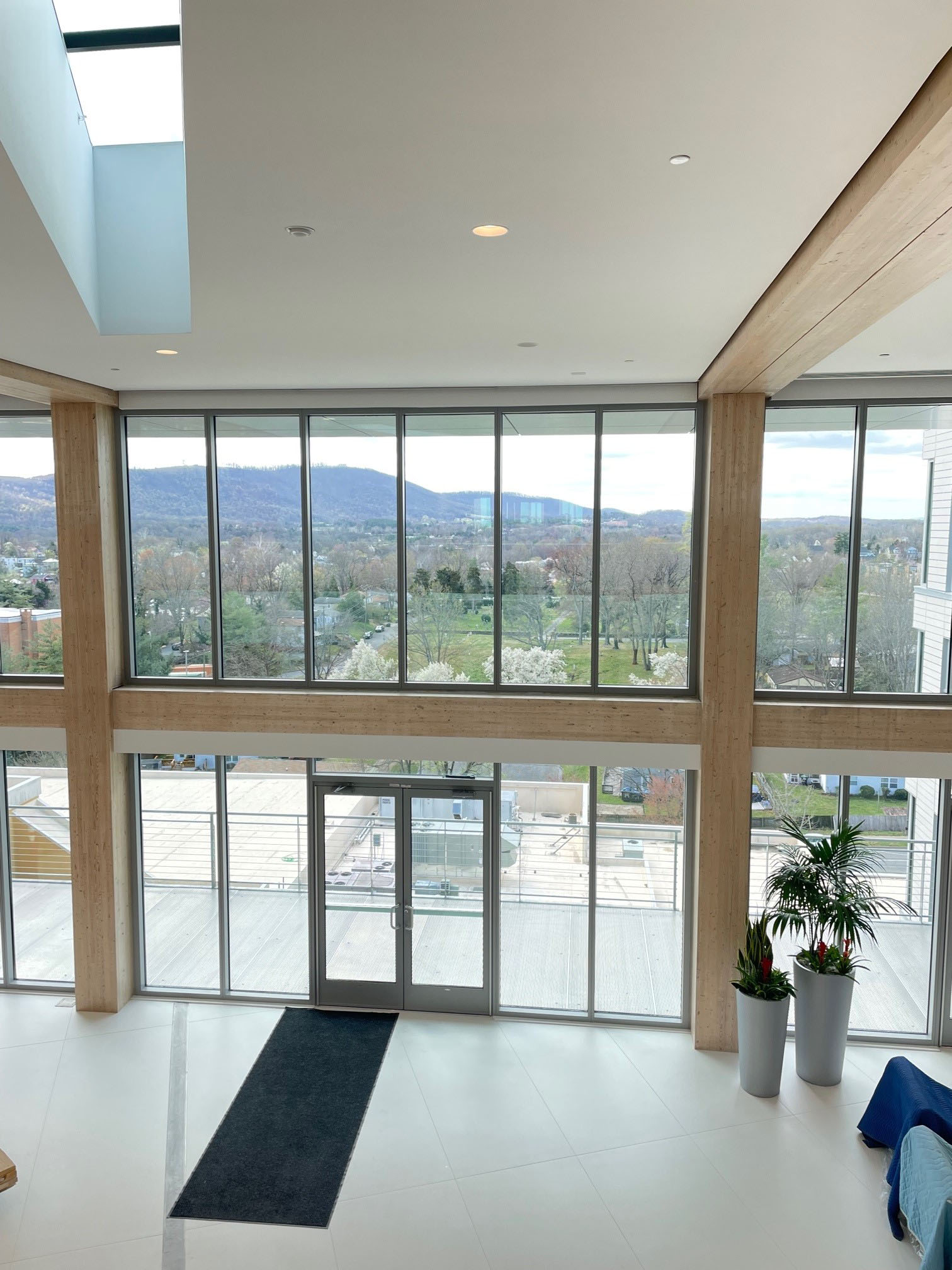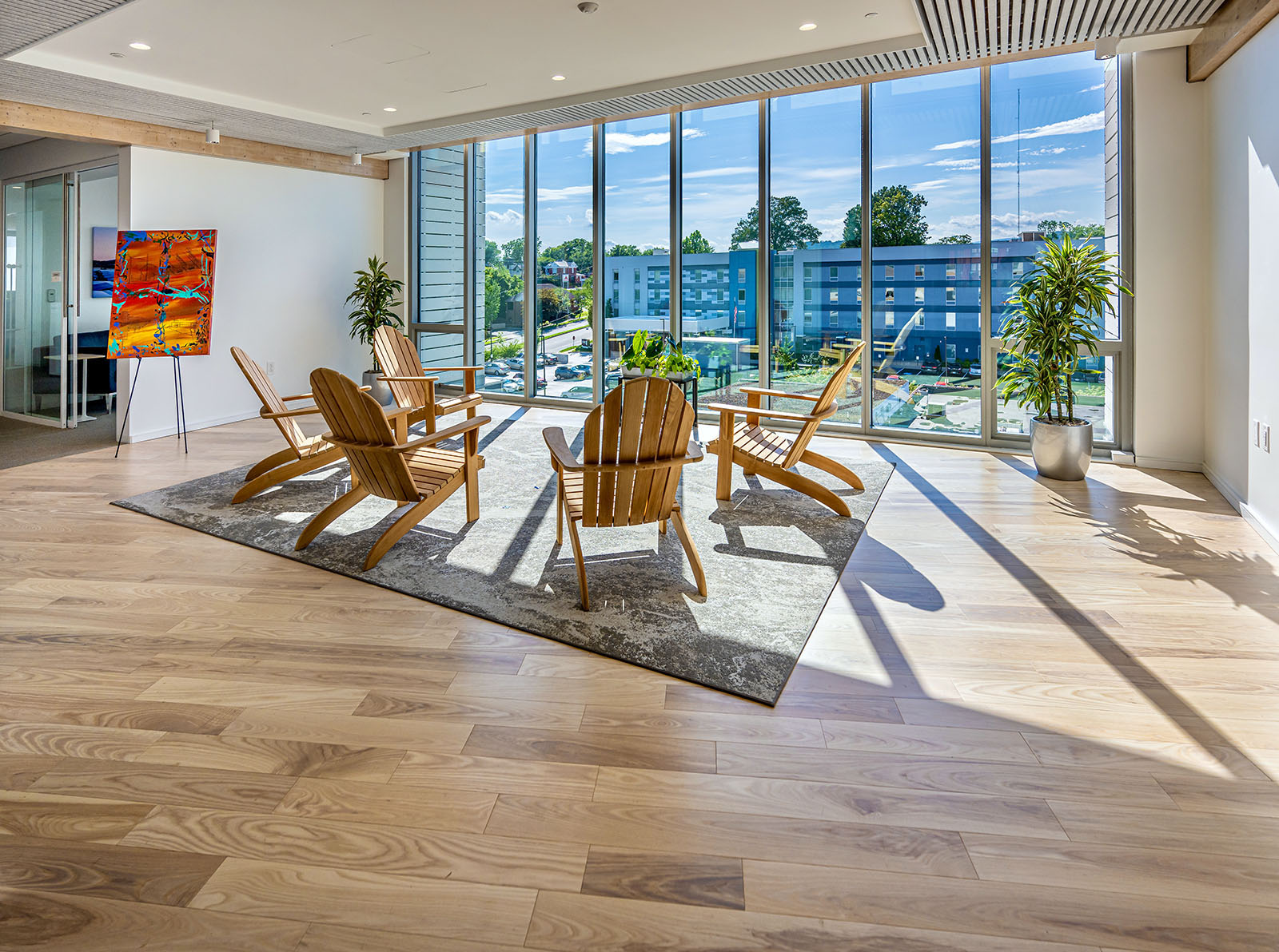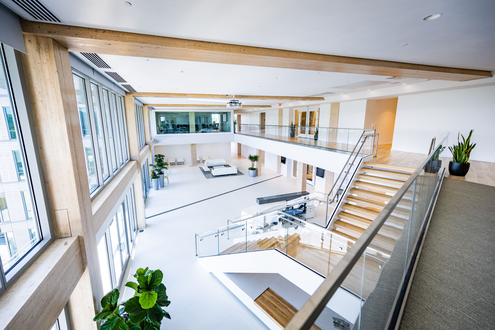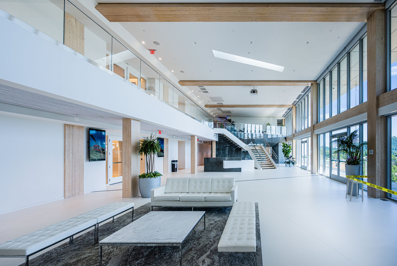 The use of structural wood harvested from fast-growth timber is one of the many sustainable features of Apex Plaza. Much like a healthy tree stores carbon dioxide, one square meter of cross-laminated timber can remove approximately one ton of the greenhouse gas from the atmosphere. Additionally, the building’s 875 solar panels are designed to produce as much electricity as lead tenant Apex Clean Energy consumes in a given year, leaving the company with net-zero electricity use.