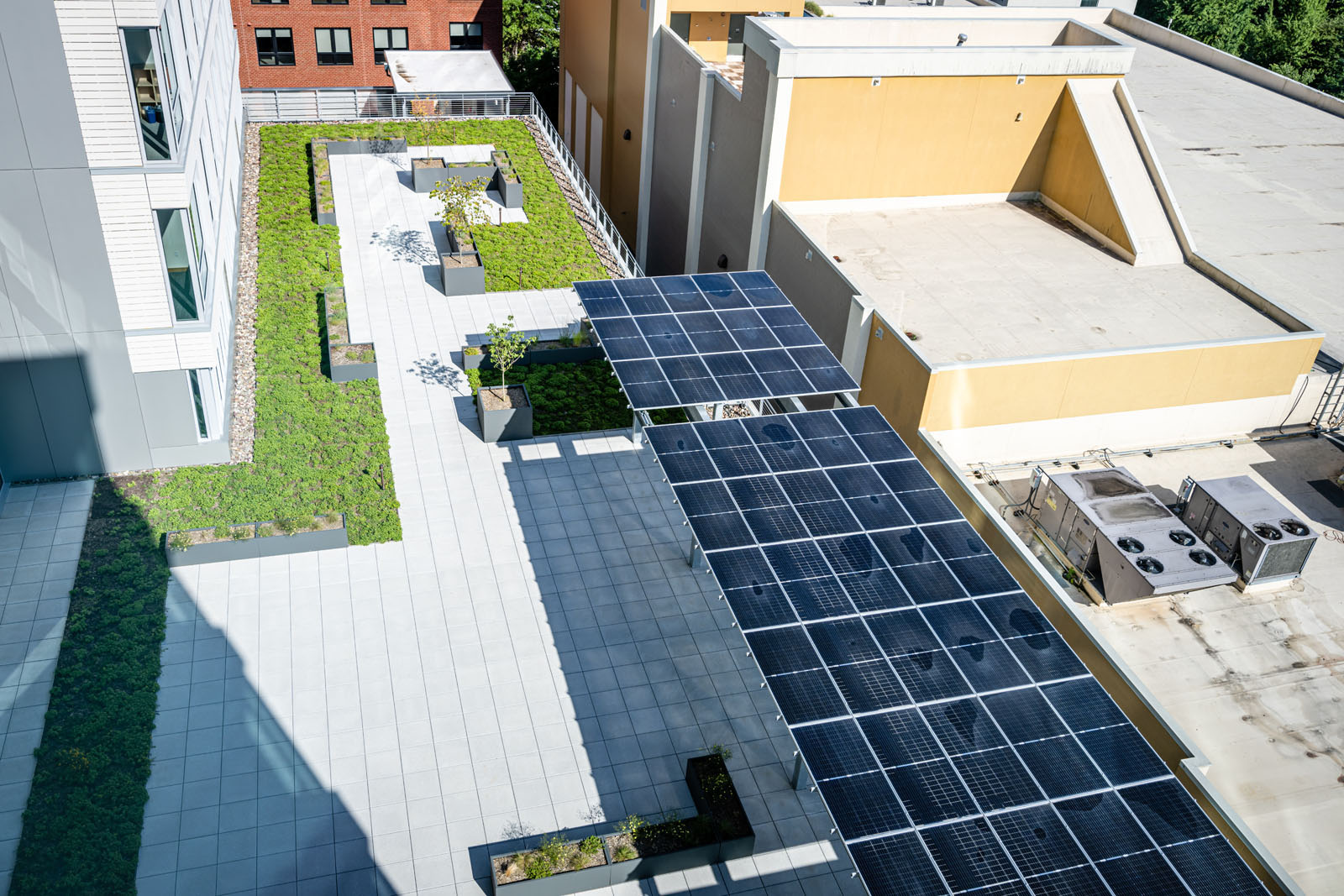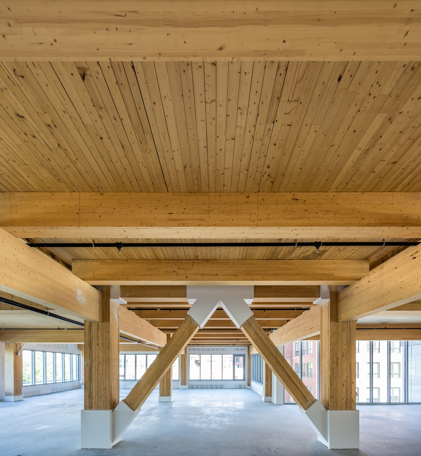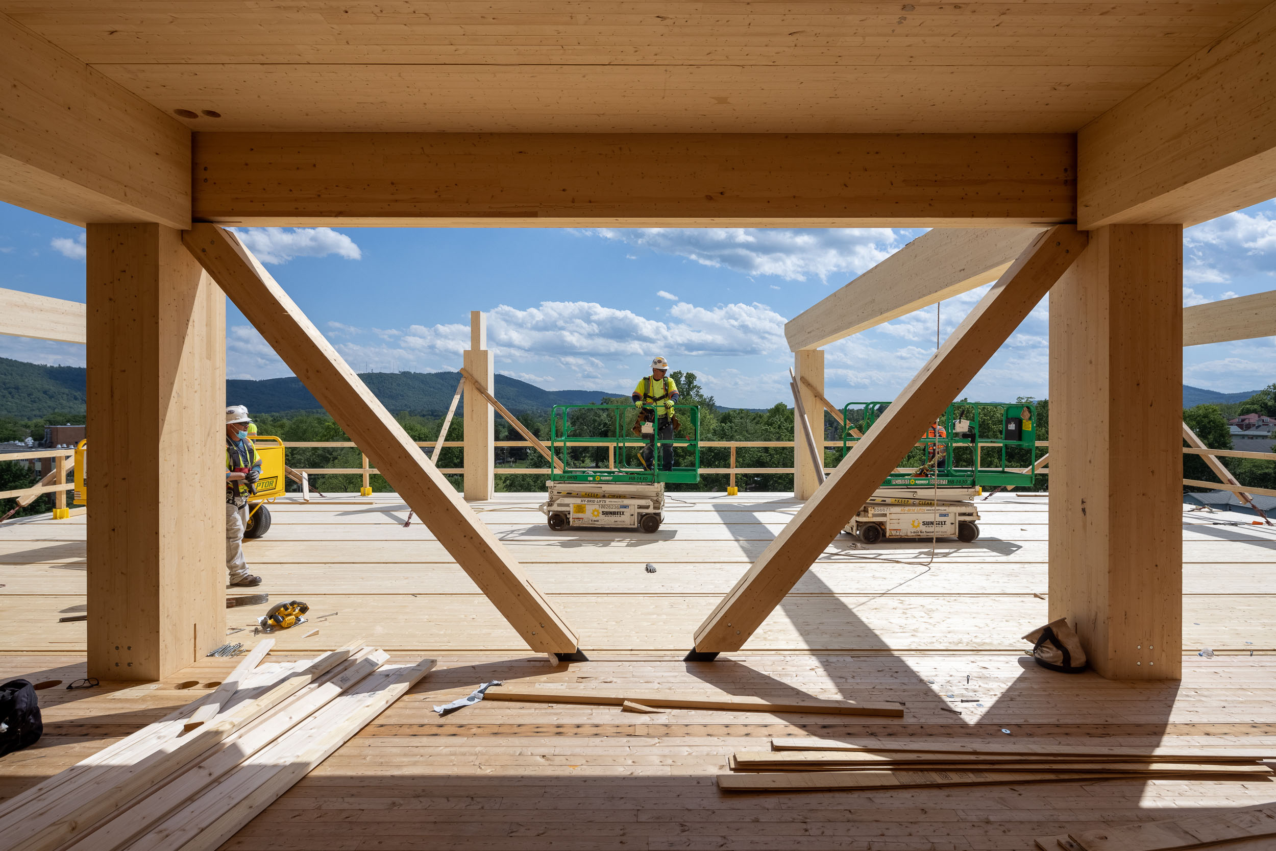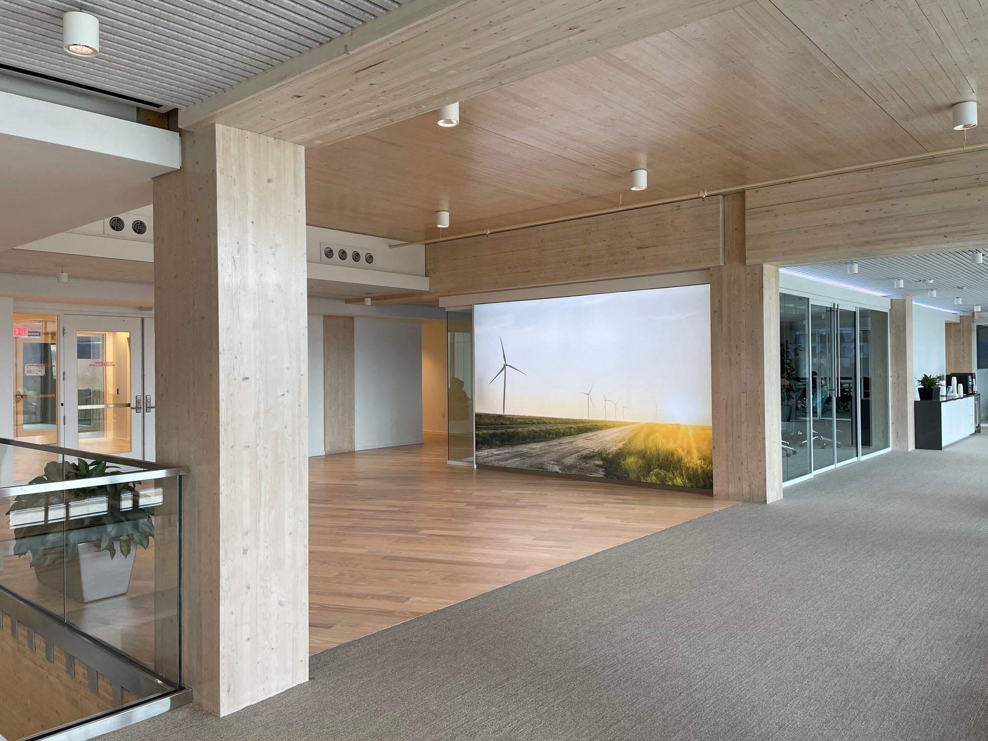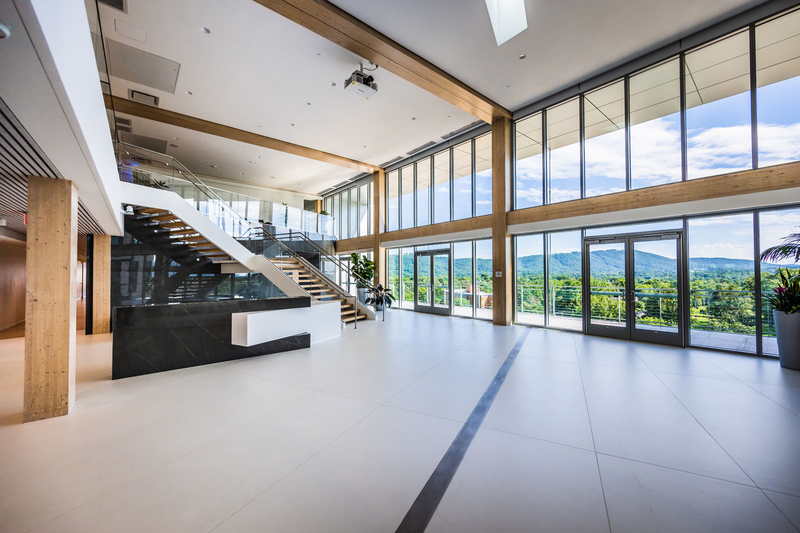 The use of structural wood harvested from fast-growth timber is one of the many sustainable features of Apex Plaza. Much like a healthy tree stores carbon dioxide, one square meter of cross-laminated timber can remove approximately one ton of the greenhouse gas from the atmosphere. Additionally, the building’s 875 solar panels are designed to produce as much electricity as lead tenant Apex Clean Energy consumes in a given year, leaving the company with net-zero electricity use.