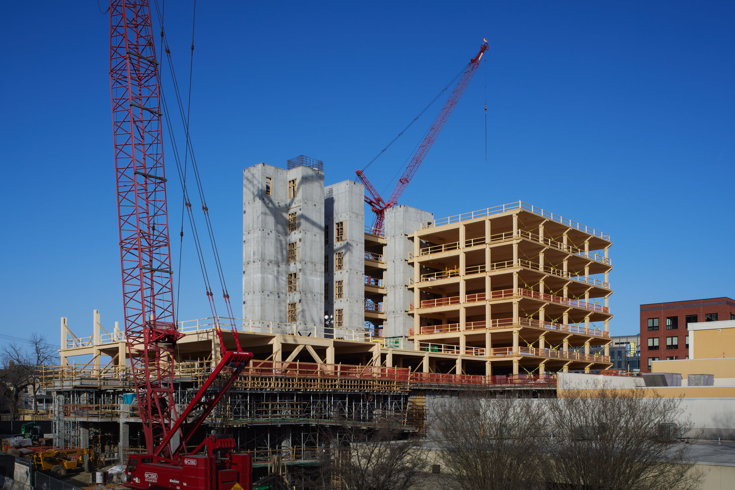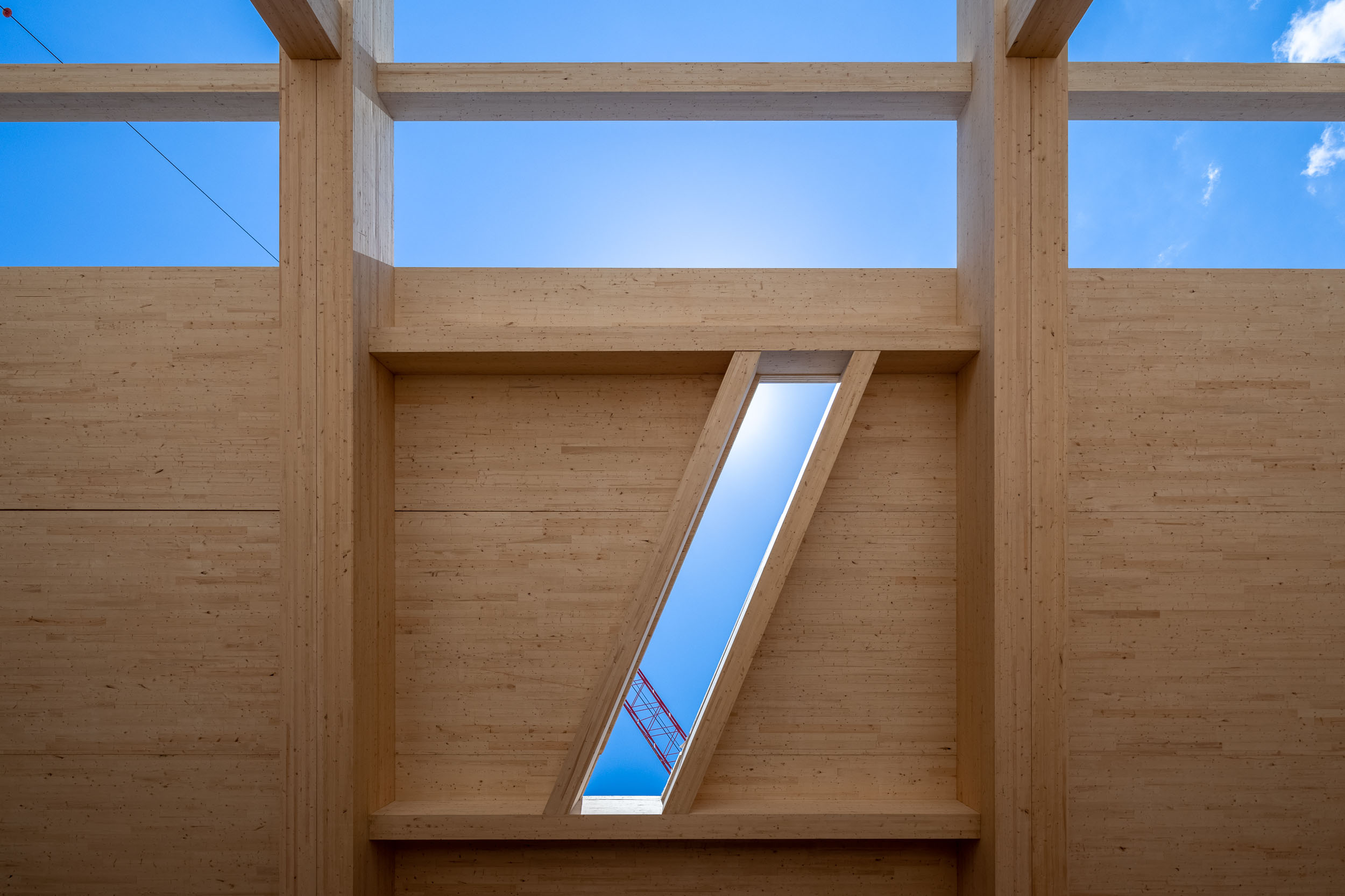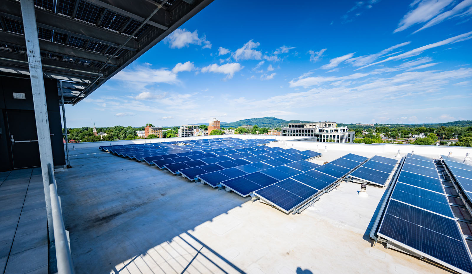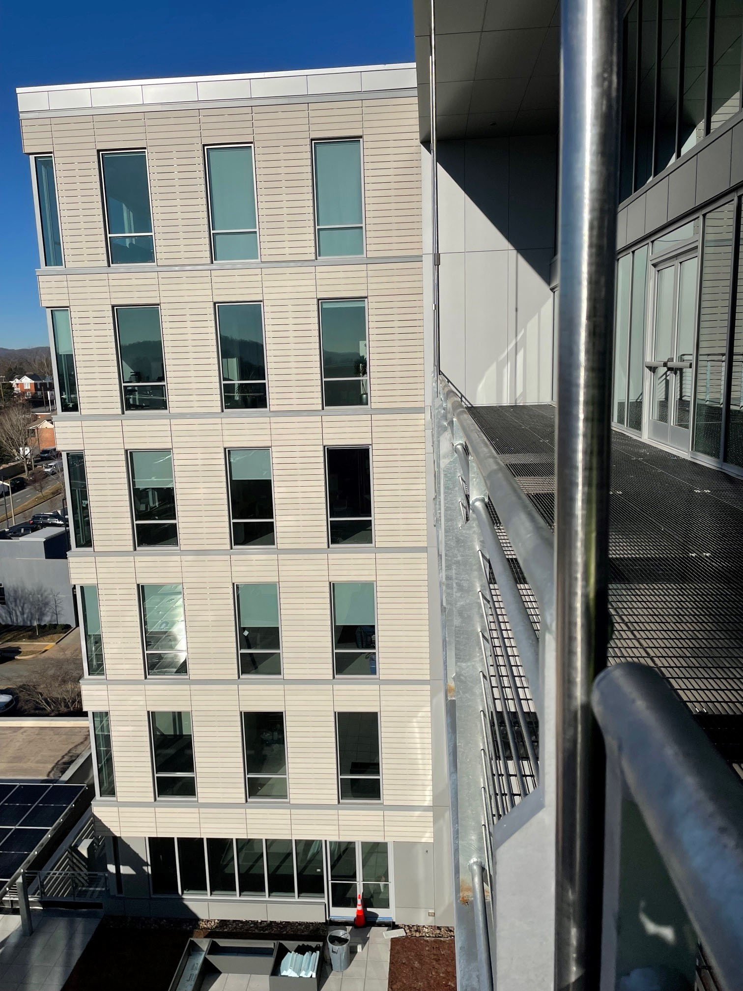 The use of structural wood harvested from fast-growth timber is one of the many sustainable features of Apex Plaza. Much like a healthy tree stores carbon dioxide, one square meter of cross-laminated timber can remove approximately one ton of the greenhouse gas from the atmosphere. Additionally, the building’s 875 solar panels are designed to produce as much electricity as lead tenant Apex Clean Energy consumes in a given year, leaving the company with net-zero electricity use.