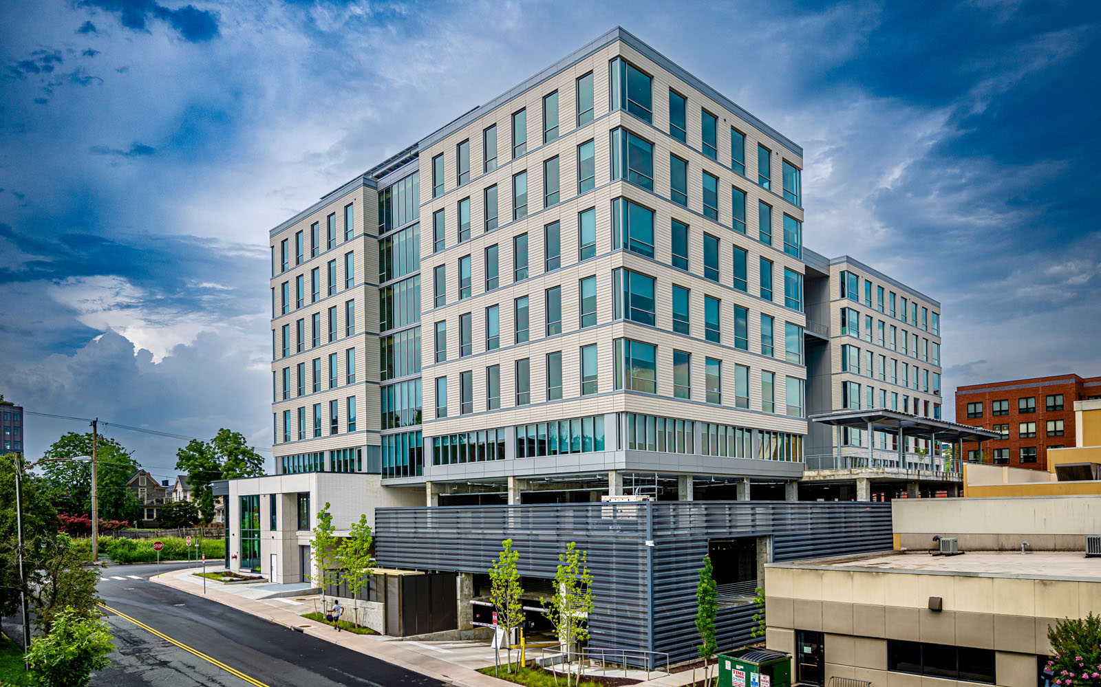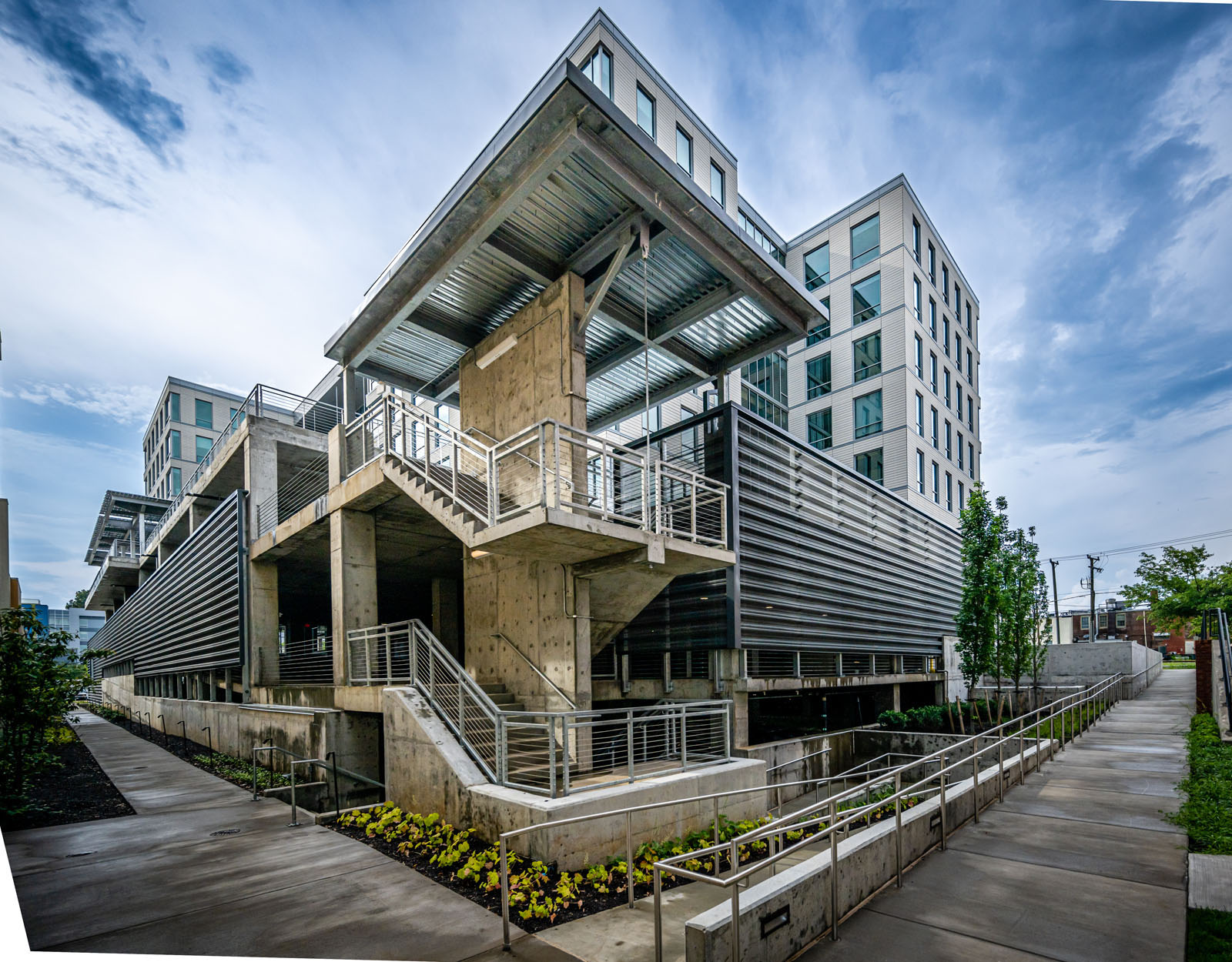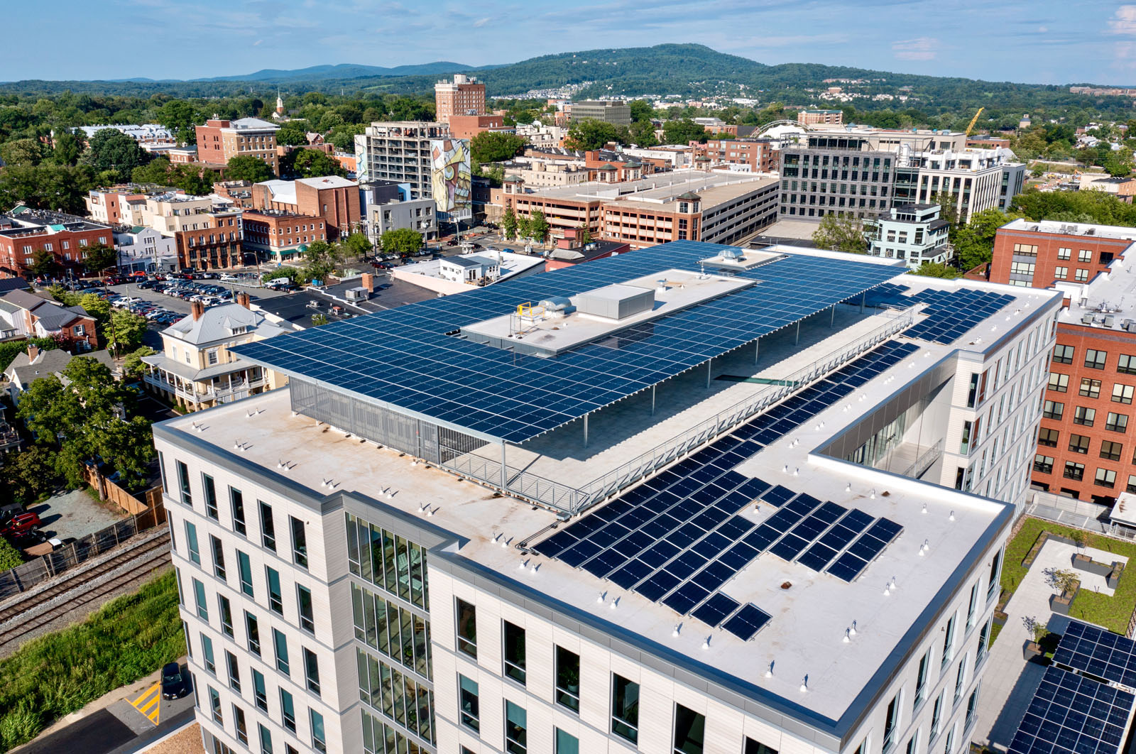 Virginia’s first and tallest large-scale Mass Timber building, totaling over 265,000 SF, is finally complete. The project includes 151,000 SF of office space, 102,000 SF podium concrete parking structure, and 6,800 SF of retail space. The cross-laminated timber (CLT) frame is sustainably harvested and the building gains a total potential carbon benefit of approximately 3,000 metric tons compared to traditional approaches. The facility boasts 875 roof-and canopy-mounted solar panels, and the structure’s green roof creates habitat to promote biodiversity and storm water retention.
