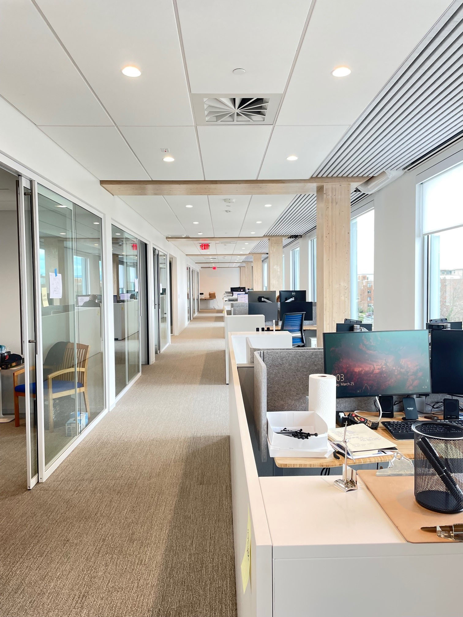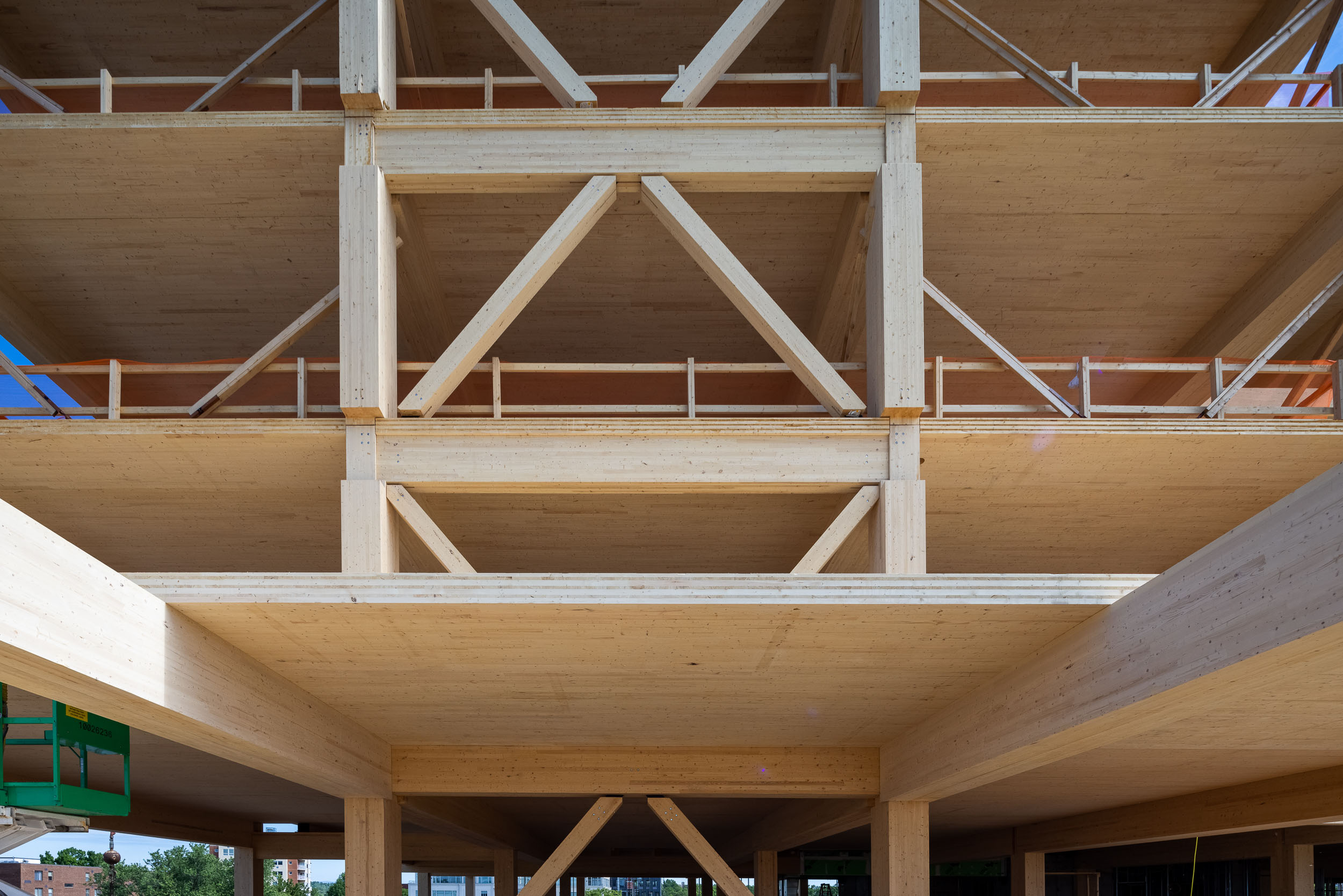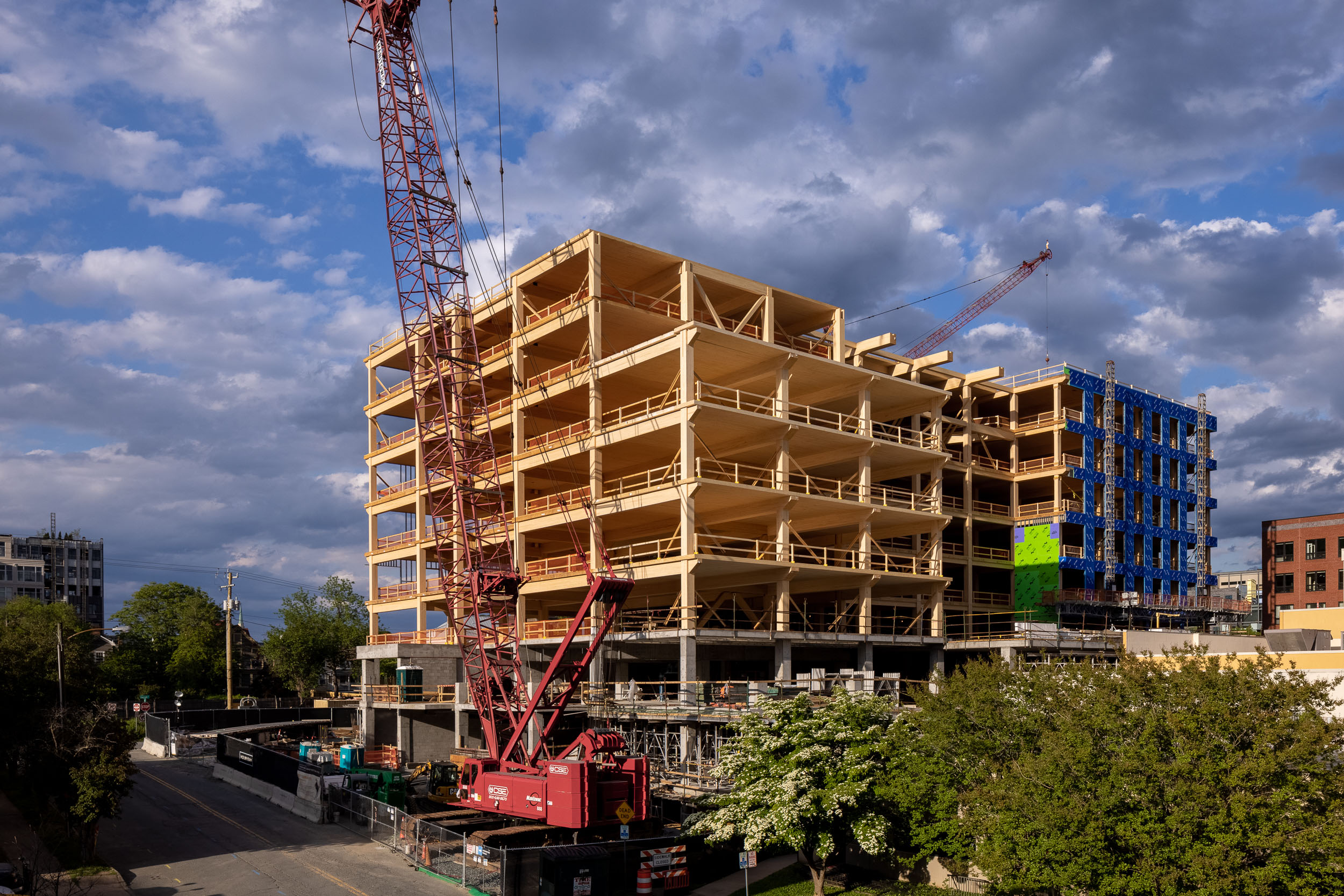 Virginia’s first and tallest large-scale Mass Timber building, totaling over 265,000 SF, is finally complete. The project includes 151,000 SF of office space, 102,000 SF podium concrete parking structure, and 6,800 SF of retail space. The cross-laminated timber (CLT) frame is sustainably harvested and the building gains a total potential carbon benefit of approximately 3,000 metric tons compared to traditional approaches. The facility boasts 875 roof-and canopy-mounted solar panels, and the structure’s green roof creates habitat to promote biodiversity and storm water retention.