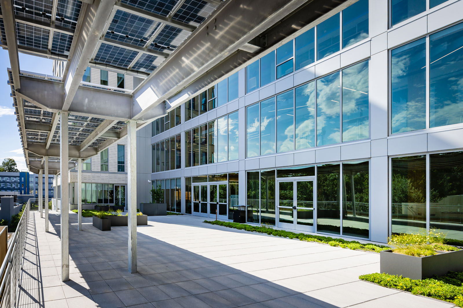 Virginia’s first and tallest large-scale Mass Timber building, totaling over 265,000 SF, is finally complete. The project includes 151,000 SF of office space, 102,000 SF podium concrete parking structure, and 6,800 SF of retail space. The cross-laminated timber (CLT) frame is sustainably harvested and the building gains a total potential carbon benefit of approximately 3,000 metric tons compared to traditional approaches. The facility boasts 875 roof-and canopy-mounted solar panels, and the structure’s green roof creates habitat to promote biodiversity and storm water retention.