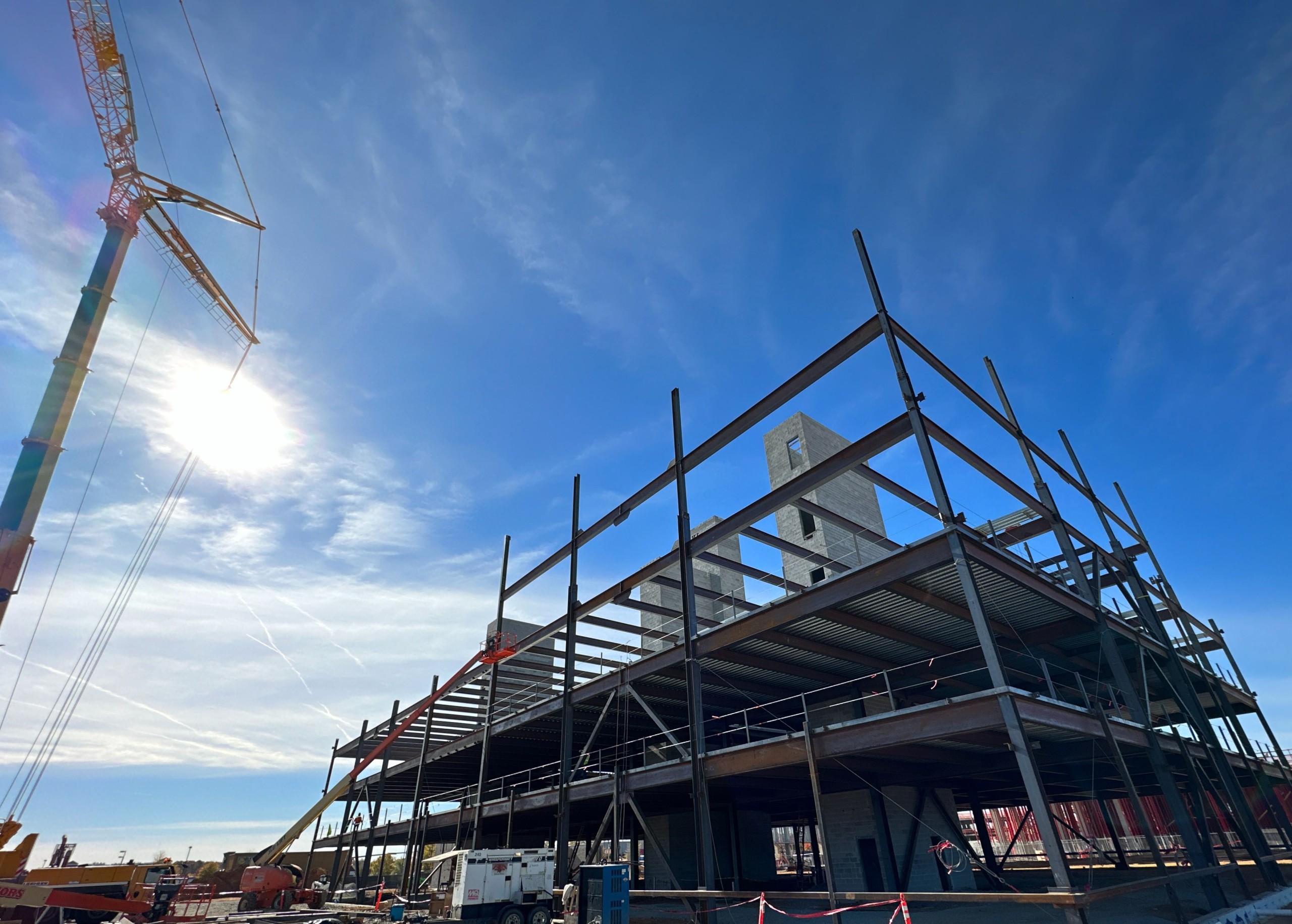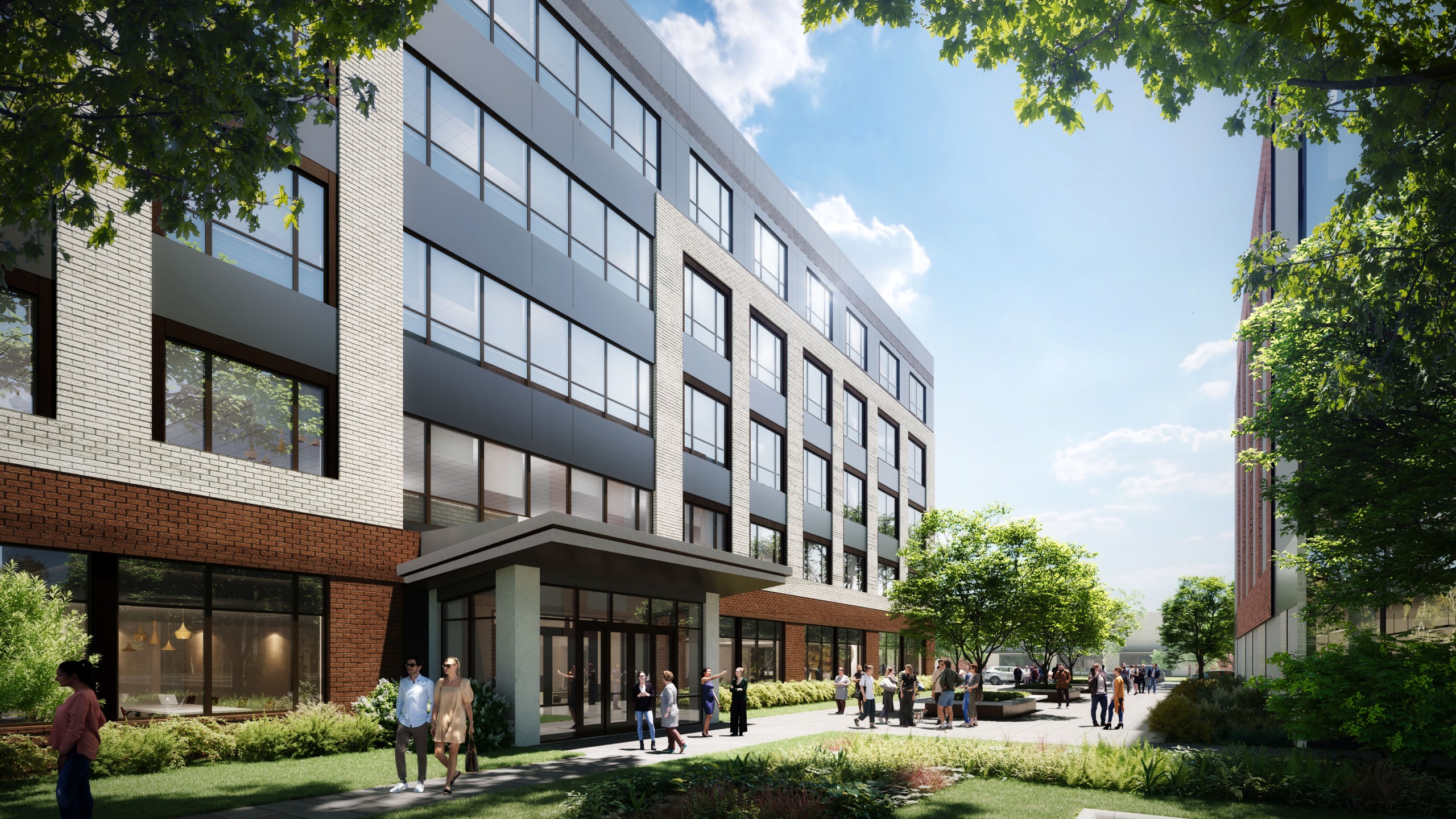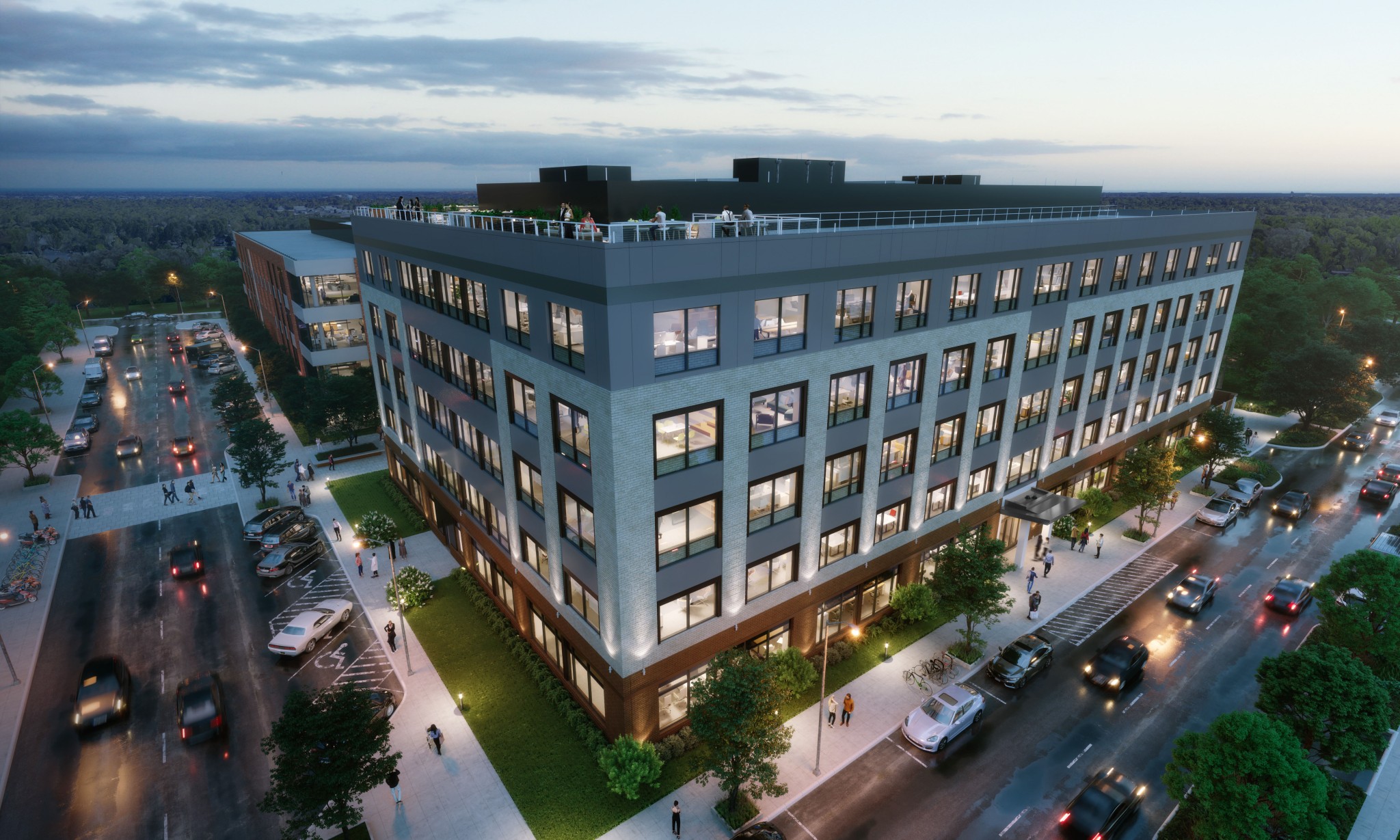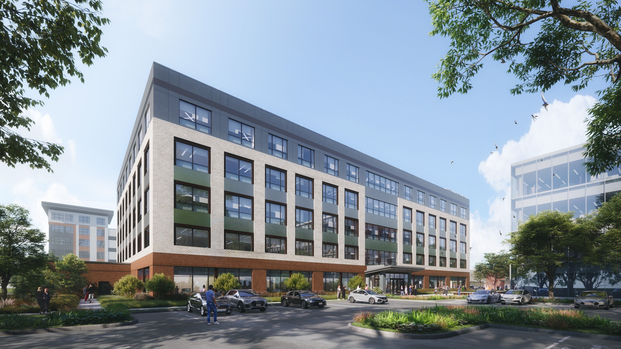 Springline Office at District 60 is a dynamic mixed-use urban village situated in Chesterfield County at the intersection of Route 60 and Chippenham Parkway. The development encompasses a 150,000-square-foot multi-tenant office building, spanning five stories plus an impressive rooftop deck, offering a modern and collaborative workspace. The office building is characterized by concrete footings and structural steel, while its exterior is adorned with a combination of storefront windows, brick, and metal panels. The office facility includes essential office and support spaces, with noteworthy amenity areas such as a welcoming lobby and a stylish rooftop party deck for social gatherings and events.
